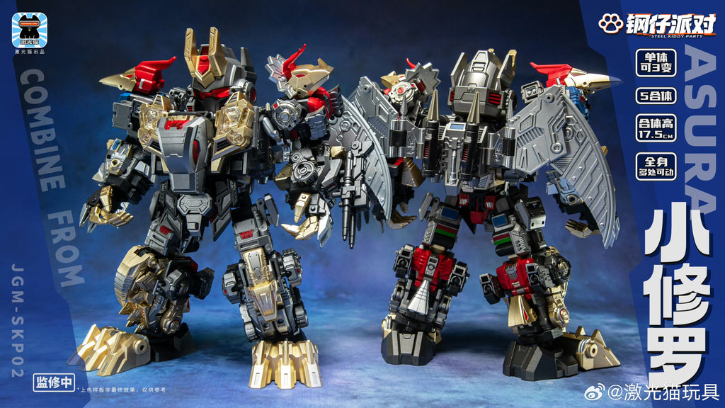 This JGM-SKP02 Mini Asura in homage to the image of G1 Predaking Combiner includes 5 transformable members (robots to dinosaurs), while other details is unknown yet.