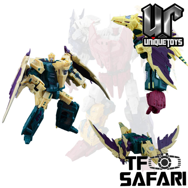 UT O05 Hagen is brought by Unique Toys (in homage to G1 Cutthroat). It can transform from robot into a mechanic flying dragon as well as one arm of the final combiner Odin. See product photos for details.