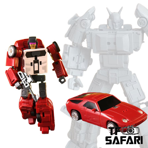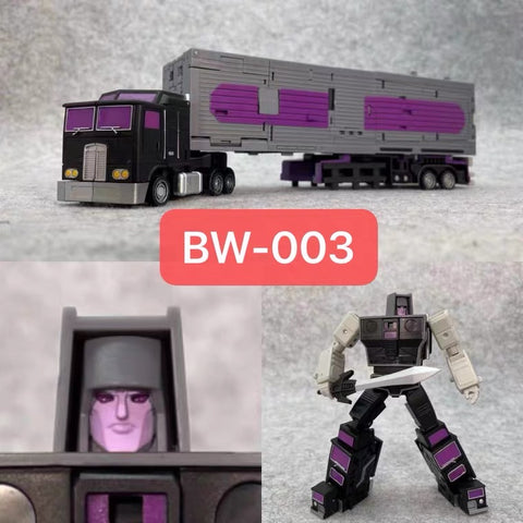 This MX-16 Deathwish by XTB / Xtransbots (A famous 3rd party transformer studio) is with its size perfectly matching official MP series (in homage to G1 Deadend). It transforms into a race car and can also combine with other 4 members of the Berserkars (Stunticons) into giant Monolith / Menasor.