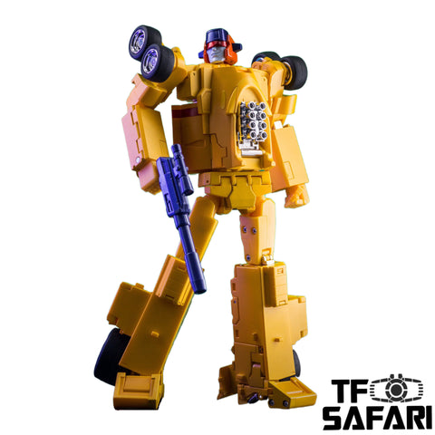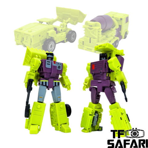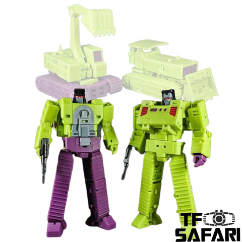 This DS-07 / DS-07B Paranoider / Bomber 2 in 1 set is the 5th release of the combiner Trouble Maker by Devil Saviour (Formerly known as Bombusbee) in homage to the image of the classic combiner Devastator in the Transformers ROTF movie. The two transform into a crane and a bulldozer and can be combined as the left arm of the trouble maker.