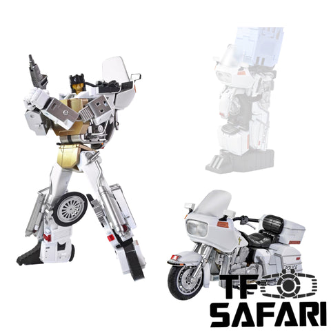 This MX-33 by Xtransbots (A famous 3rd party transformer studio) is a transformation robot with its size perfectly matching official MP series (in homage to G1 Groove). It can transform into a police motorcycle.