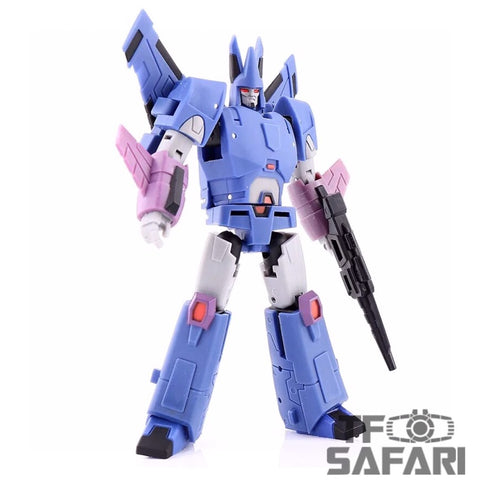 This ZB-05 Downthrust , by ZETA Toys in homage to the Skydive (member of the aerialbots), is a MP size robot figure transforming into a Jet Fighter. It can also combine with other 4 robot members of Sky Terror into the most giant combiner Kranos (in homage to G1 Superion).