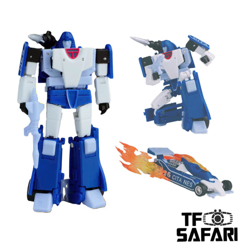 This MS-B43 Shadow Master in homage to G1 Mirage by Magic Square (MS-Toys, a famous 3rd party transformer studio focusing on pocket size toys), it is of extremely high articulation and transforms into a white Formula 1 race car.