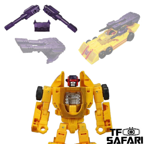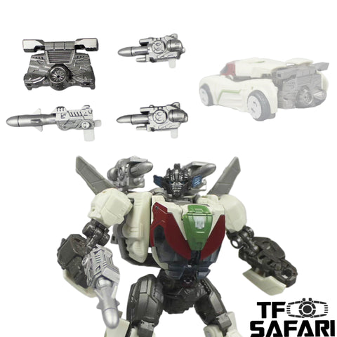 A new set for WFC Siege G2 Black Sidewipe. The whole set would include the main accessories like laser gun, hand blade, spike wheels, ammo bands and etc. All of the weapons can be carried with the Vehicle mode.
