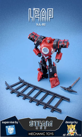 This SA02 Leap is paying homage to the image in IDW comic: Hearts of Steel. This robot transforms into locomotive with a hammer as its weapon. This is a reissue version of HS14 Iron Hero Bumblebee with modified model, more re-painted veraions and better plastic materials.