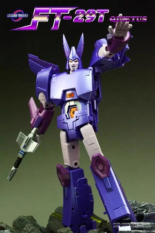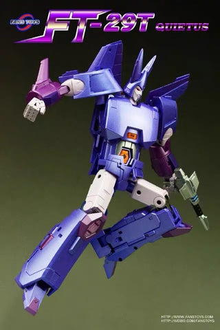 In homage to G1 Cyclonus, this FT-29 Quietus inherits the consistent high quality which is always brought by Fanstoys (FT) (one of the best 3rd party transformer studio). Quietus can change from Robot into a cybertronian space jet, and is equipped with a laser rifle and two katanas.