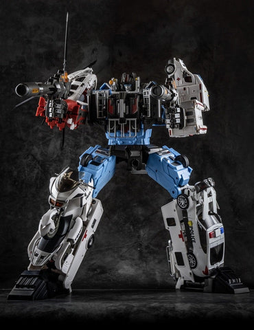 This GT-08E Foo Fighter, another masterpiece by Generation Toy (3rd party transformer producer), transforms into an fire engine and the main body of the GT Guardian. The figure features die-cast parts, rubber tyres, and transparent windows.