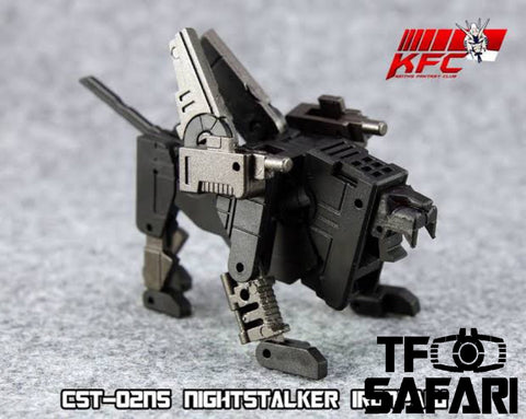 This CST-02NS Nightstalker by KFC toys, in homage to the G1 Steeljaw, transforms into a mechanic black leopard . The size fits to the chests of G1 / MP size Blaster or Soundwave.
