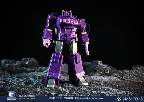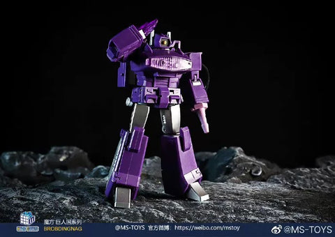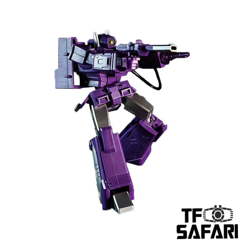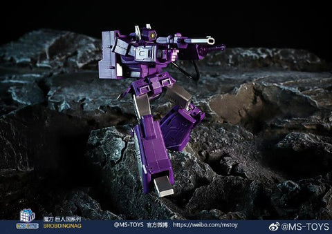 It transforms into a purple laser gun, in homage to G1 Shockwave. The design of the figure follows the classic design of MP Shockwave, with its arm cannon can be lit up (with battery to be installed by yourself).