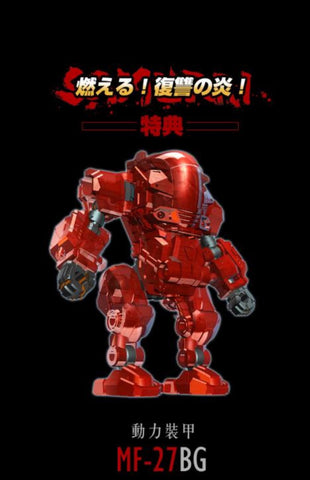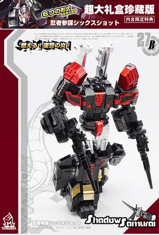 MF27B Shadows Samurai is a repainted black version of MF-27 Sixninja by Mech Fans Toys. It would be a six-changer in homage to G1 Sixshot. This reissue version would be released with a new red power-suit as a special gift.
