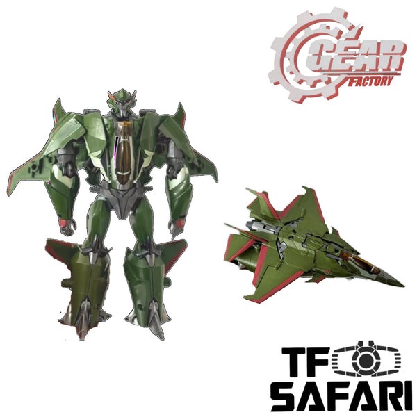 Brought by Gear Factory (A new 4th / 3rd party studio, avatar of APC Toys ), this Gale transforms into a green cybertronian jet fighter. It also comes with a lot of accessories.