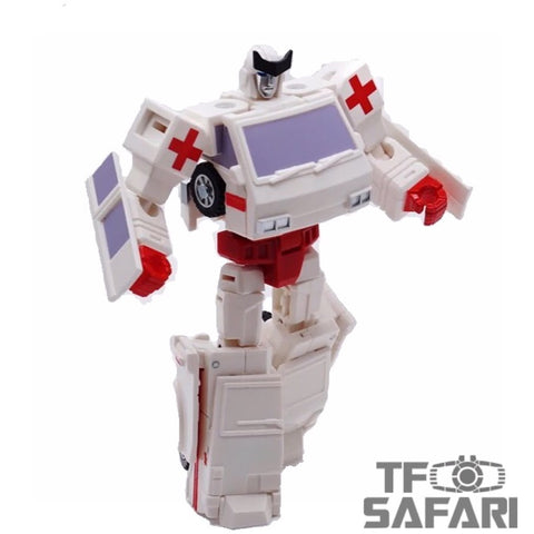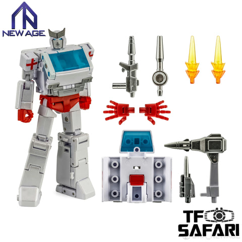 This NewAge H8 Miller ( Inspired by G1 Ratchet ) by NewAge (A new 3rd party Transformer Studio focusing on pocket size toys) is of legends scale and transforms into white ambulance.