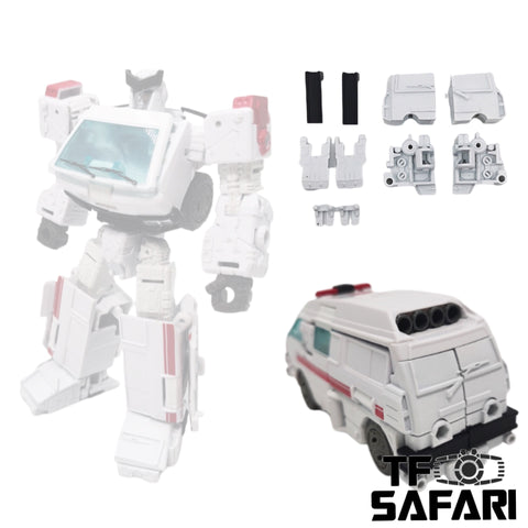 Cute tiny Ambulance (Ratchet) by Mech Planet, with ambulance as its disguise form and its backpack independently transforming into small armed vehicle (Same design as Irontin)