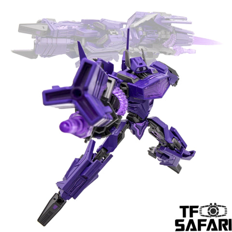 It transforms into a purple laser gun, in homage to G1 Shockwave. The design of the figure follows the classic design of MP Shockwave, with its arm cannon can be lit up (with battery to be installed by yourself).