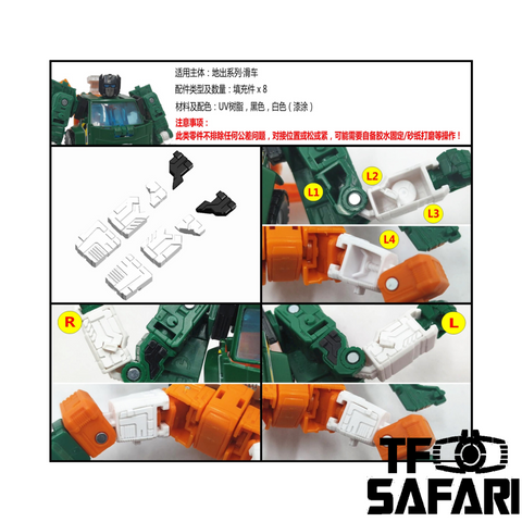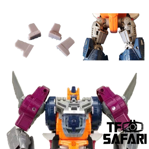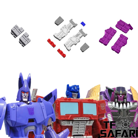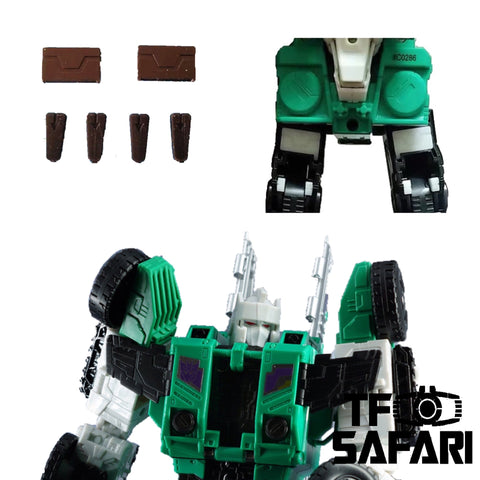 2 × new leg cannons (with color tone more compatible to the toy)2 × gap fillers for the back cannon2 × upgrade kits for the vehicle mode ( for the tail of the trailer ).