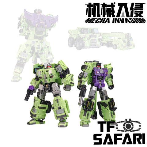 Features:  Note: Pre-Order customers if you haven't received our full payment notification pls click  here  for solutions.   This GLA05 & GLA06 2 in 1 Set by a new 3rd party studio Mecha Invasion is designed in homage to Bonecrusher and Scavenger in the constructicon team. Both of them transform into engineering machines and parts of the final combiner Heavy Builder. This Devastator-like combiner is said to be another fully-built-in combiner without extra accessories needed for the combination.  Each member stands around 21.5cm / 8.5" tall, while the final combiner may stands 38cm tall (from head to toe)    Status:  2025-6 Reissue batch in stock Parameters: Producer Mecha Invasion Height Robot Form height 21.5cm / 8.5" Material ABS Plastic Shipment From China Note Devastator