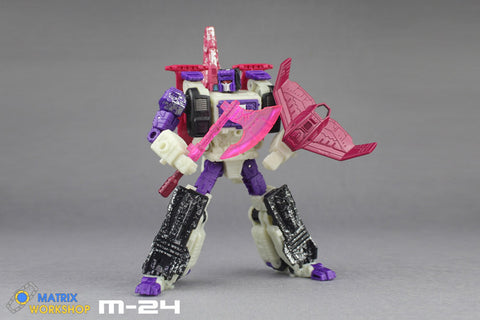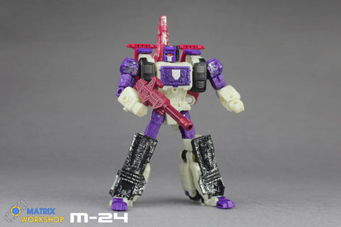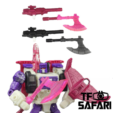 A new weapon set with enhanced details for WFC Siege Apeface by Matrix Workshop, making it closer to the image in G1 animations. For this set MW would offer two different color, G1 Violet and Siege Black.