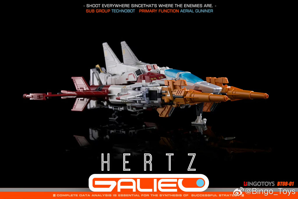 This BT0801 Hertz is the 1st member of its Galieo combiner brought by Bingo Toys (A brand-new 3rd party transformers toys studio.). It transforms into a cybertronian space fighter as well as the left arm of the final combiner